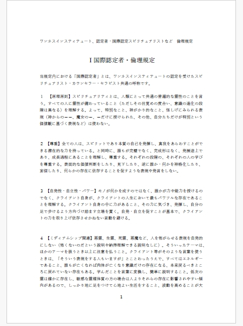 認定の手続きを進めさせていただくにあたり、ワンネスインスティテュート倫理規定へ同意いただくことが必要です。同意の意思をご回答いただくには、以下の画像をクリックorタップしてワンネスインスティテュート倫理規定(PDFファイル1.1MB)を全てお読みいただいた後、その下にある「倫理規定へ署名はこちらから>>」より必要事項のご回答・記名をお願いいたします。